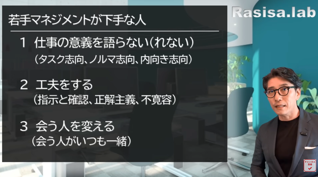 じゃあ「若手マネジメントが上手で、いい上司の下についたな」と思ってもらえるためには何をすればいいか? この3つの観点から(若手マネジメントが下手な人とうまい人では)ここまで違うという話をします。