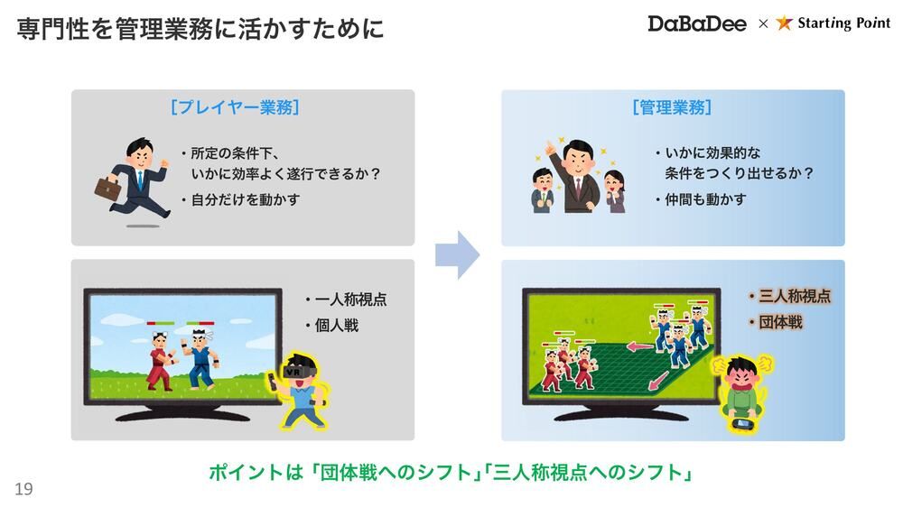 ここで出てくるのが、「団体戦へのシフト」と「三人称視点へのシフト」になってきます。ということで、じゃあ実際に管理業務へ強みをシフトさせるにはどうしていくんだ? ということを見ていきたいと思います。