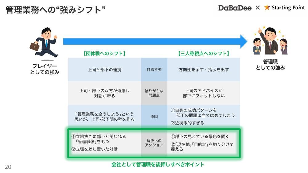 この解決へのアクションは、私自身も管理職になった時にすごく悩みました。これって管理職自身が自分の力で乗り越えられるものかというと、そうではないんじゃないかと思っています。やはりこれは、部長や会社として管理職に関わっていくことによって、高めていく必要があるなと思っています。会社として後押しするべきポイントですね。