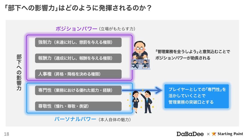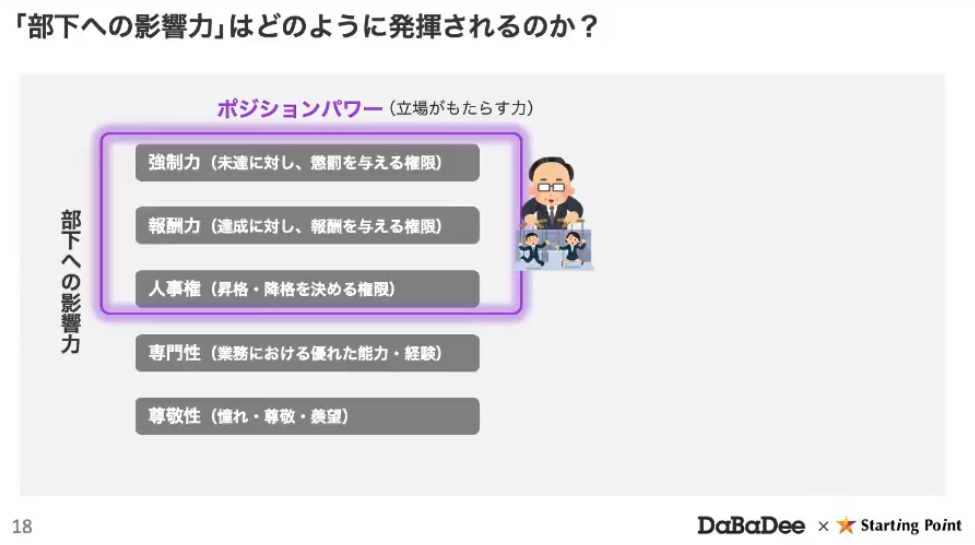 ただ、やはりこれは諸刃の剣というか、脆い部分があって。その人が「課長」という立場を降りちゃうと、まったく(部下が)話を聞いてくれなくなる、みたいなものでもあります。なので、本当に影響力として強いものかというと、ちょっと脆さがあります。