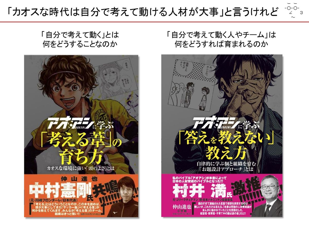 ・仲山進也氏は、サッカー漫画『アオアシ』に登場する福田監督の手法を例に、「答えを教えない教え方」を提唱。