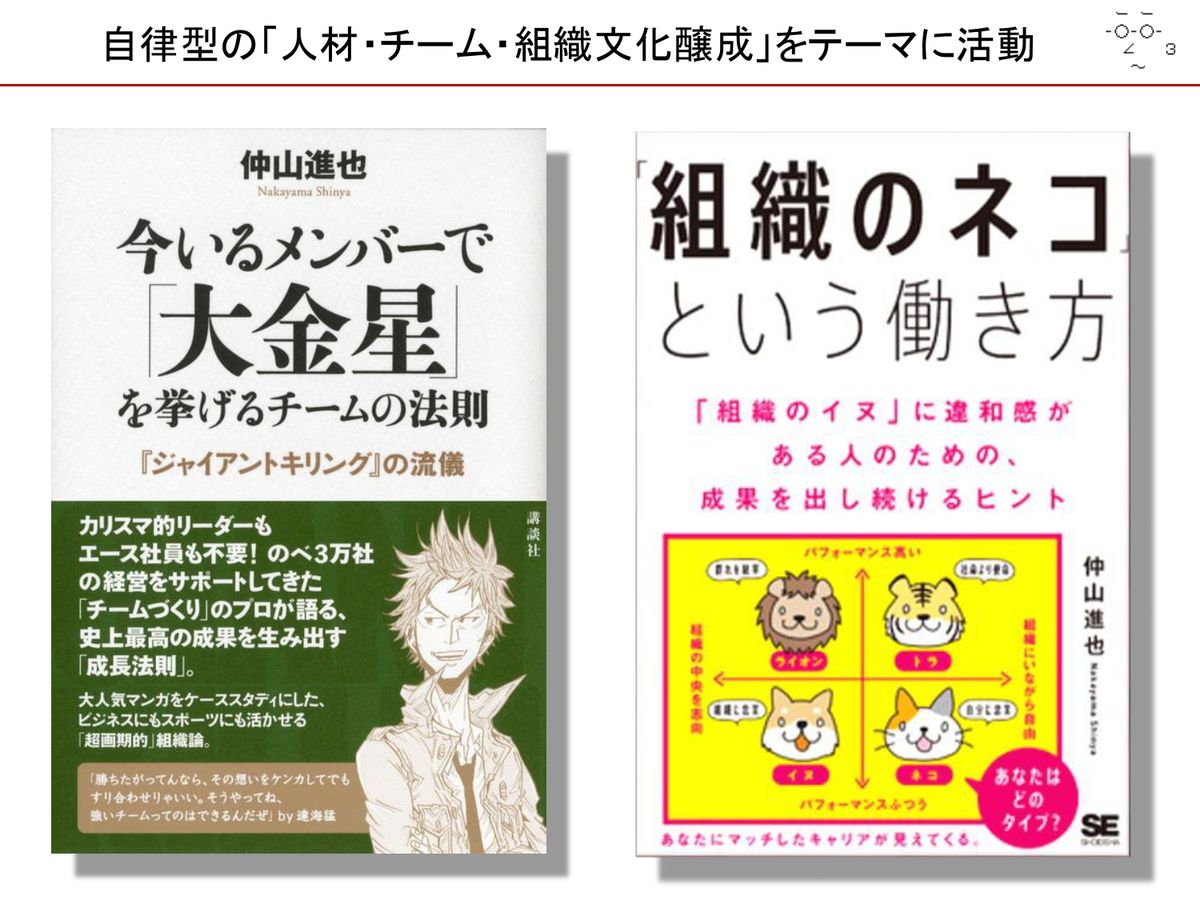 仲山進也氏:まず、自己紹介したいと思います。ふだんは「自律型の人材とか、チームとか組織文化ってどうやったらできるのかね?」みたいなことをテーマに活動していることが多いです。(スライドを示して)左側の本(
