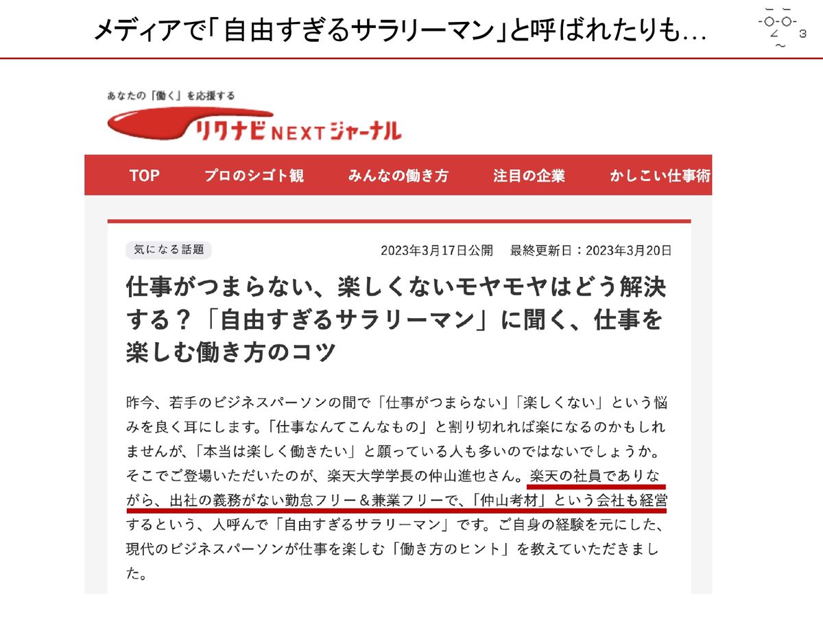 あと、僕自身の働き方がカオスな感じになっていて、「自由過ぎるサラリーマン」と紹介していただくこととかがあります。具体的に言うと、一応楽天の正社員を26年ぐらいやっているんですけど、兼業自由、勤怠自由で人事考課もなし。