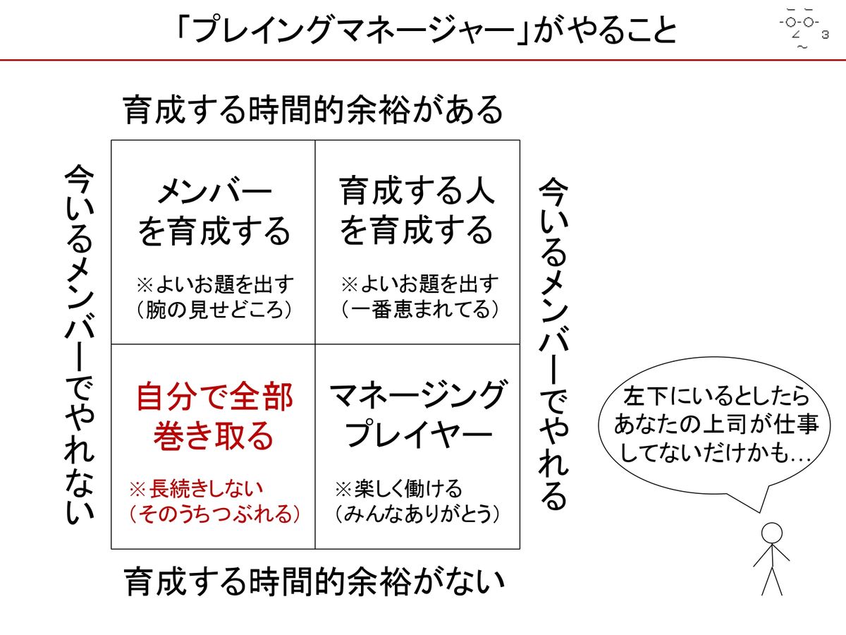 (スライドを示して)プレイングマネージャーということでちょっと考えてみました。「今いるメンバーでやれている状態・やれていない状態」を左右に取って、「メンバーを育成する時間的な余裕がある・なし」で4象限にした図です。