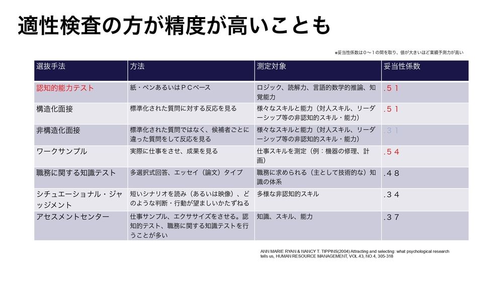 当然ながら、認知的能力テストみたいなところは、見てみると、実は意外と構造化面接とほぼ同じ。ワークサンプルと、並ぶぐらい妥当性が高いです。こういったところから、実は人間が物を見る、あるいは人を判断するよりも、適性検査などの客観的な検査によって、見るほうが精度が高いこともあるというのが常識になってきたということなんです。