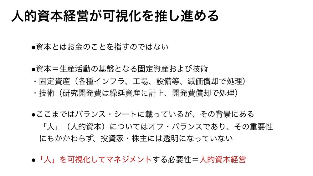 さらに、これを推し進めているのが人的資本経営ですね。要は人的資本っていうのは、その他のこういう固定資産とか技術とか、その人事的な側面っていうのは、バランスシート(貸借対照表)に載るようなものじゃなかったわけですね。