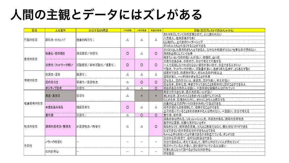 例えば、(スライドを示して)細かいデータで申し訳ないんですけど、ある会社で、この右側に詳細ってありますけど、どんな人がうちには向いているのかっていうのをこうやってブレストしたんですね。言ってみれば人間の主観です。