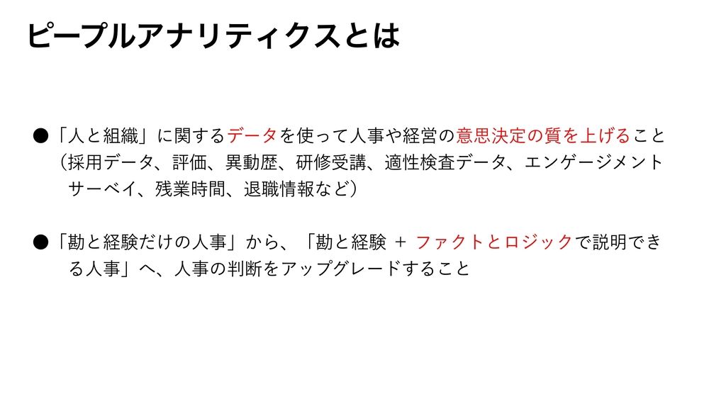 ピープルアナリティクスって、そのまま直訳すると「人の分析」ってことなんですけど、要は人と組織に関するデータを使って、人事や経営の意思決定の質を高めていくと。使うデータは、採用のデータ、評価、異動歴、研修受講データ、あるいは適性検査。これが大事ですね。