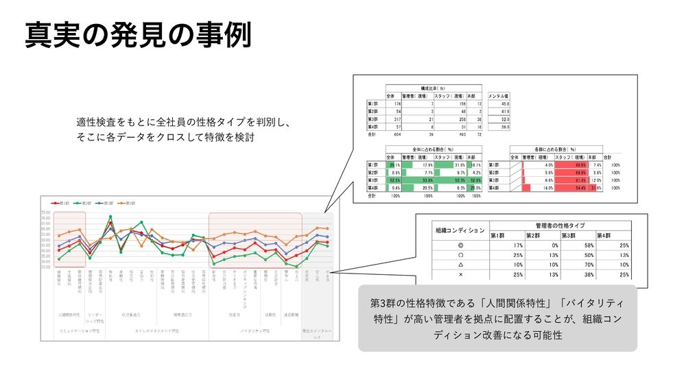 (スライドを示して)真実の発見の事例っていうのは、先ほども見ましたけど、例えば適性検査を行って、これ、クラスター分析っていう、似たような人たちを群に分けていくような分析なんですけど。例えばそれを全社員に行って、こういうふうに、どういうパターンに分かれるかっていうのを見てですね。