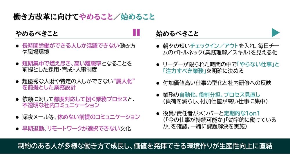 最後に一言いただきたいなと思いますのは、今の経済界でよく言われている「労働時間の上限をもっと引き上げたほうがいい。裁量をもっと与えて、労働時間を測らなくていいんだ」ということですが、一瞬そのほうが柔軟に働けるから成果が出そうな気はするんですが、果たしてそれをやっていく先に、本当にこの国の経済成長や勝ち筋ってあるのだろうか? みたいなところをお二人から聞いてみたいなと思います。