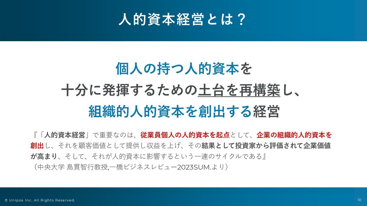 これは中央大学の教授の方がインタビューの中でお答えいただいていた内容をお借りしているんですけれども。「人的資本経営というのは、個人の持つ人的資本を十分に発揮するための土台を再構築し、組織的人的資本を創出する経営である」と、お答えになられています。
