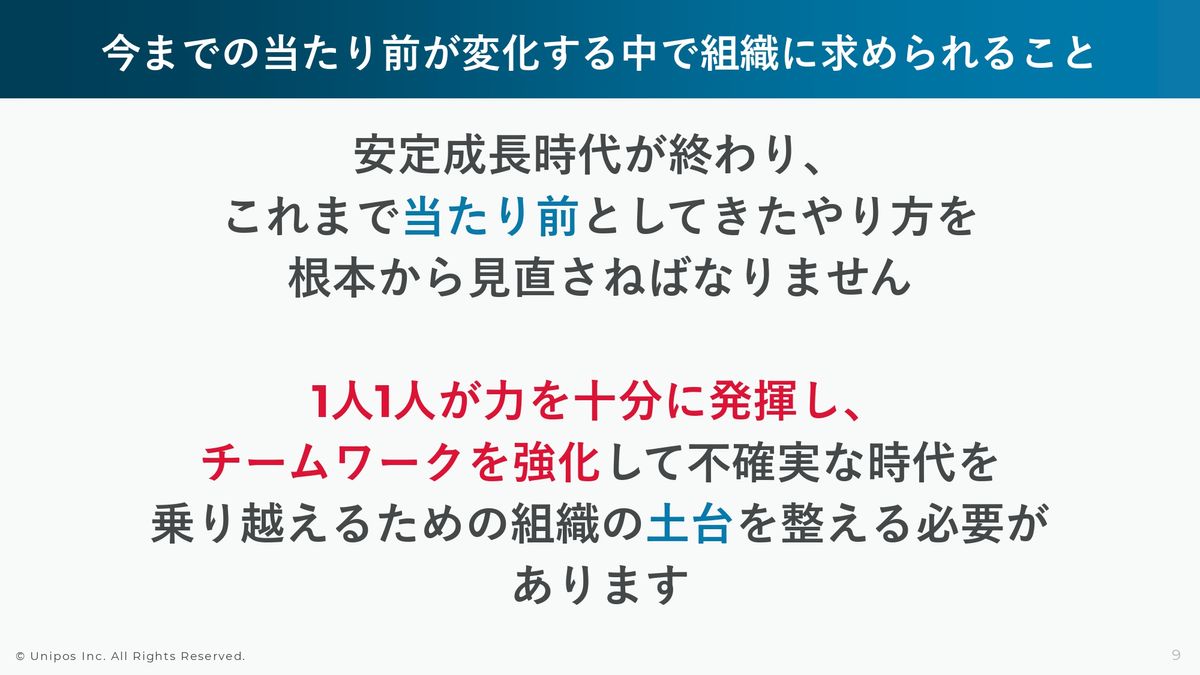 ですので、この心理的安全性というテーマにおいても、今までの当たり前が大きく変化している状況になるため、この当たり前を見直して、やはりきちんと根本から変えていくことに、会社として取り組んでいく必要が非常に高まっているタイミングかなと思います。