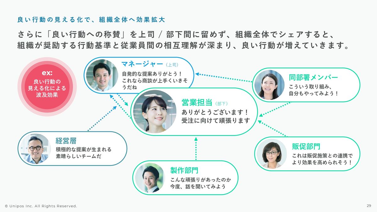例えば、みなさまも部署内のミーティングや月次の定例会みたいなもので、誰かが「あなたのこの前の提案、すごく良かったよ」「〇〇さんのこの前のノウハウの共有がすごくチームの役に立っているよ」という場面に出くわしたことが一度はあられるんじゃないかなと思います。