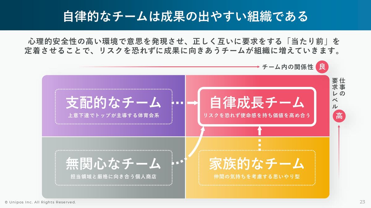 ですので、メンバーのみなさまが「こうやったらいいんじゃないかな?」「ああいうふうにしたらいいんじゃないかな?」という前向きな挑戦や改善を行うための概念が、心理的安全性になります。これらの活動は仕事の要求レベルも高く、チーム内の関係性も非常に良い、自律成長的なチームを組織の中に増やしていく活動です、と言い換えることができると思っています。
