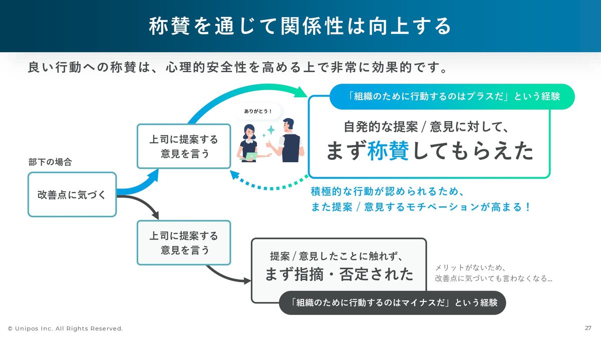 褒めるか褒めないか、称賛するかしないか、受け入れるか受け入れないか、というこの分岐点において、メンバーの方々の次なる行動というものは、もう本当に天地の差が生まれるぐらい変わってしまいますので、褒めるということが重要である、有効であるというところは、みなさまのイメージどおりだと思います。