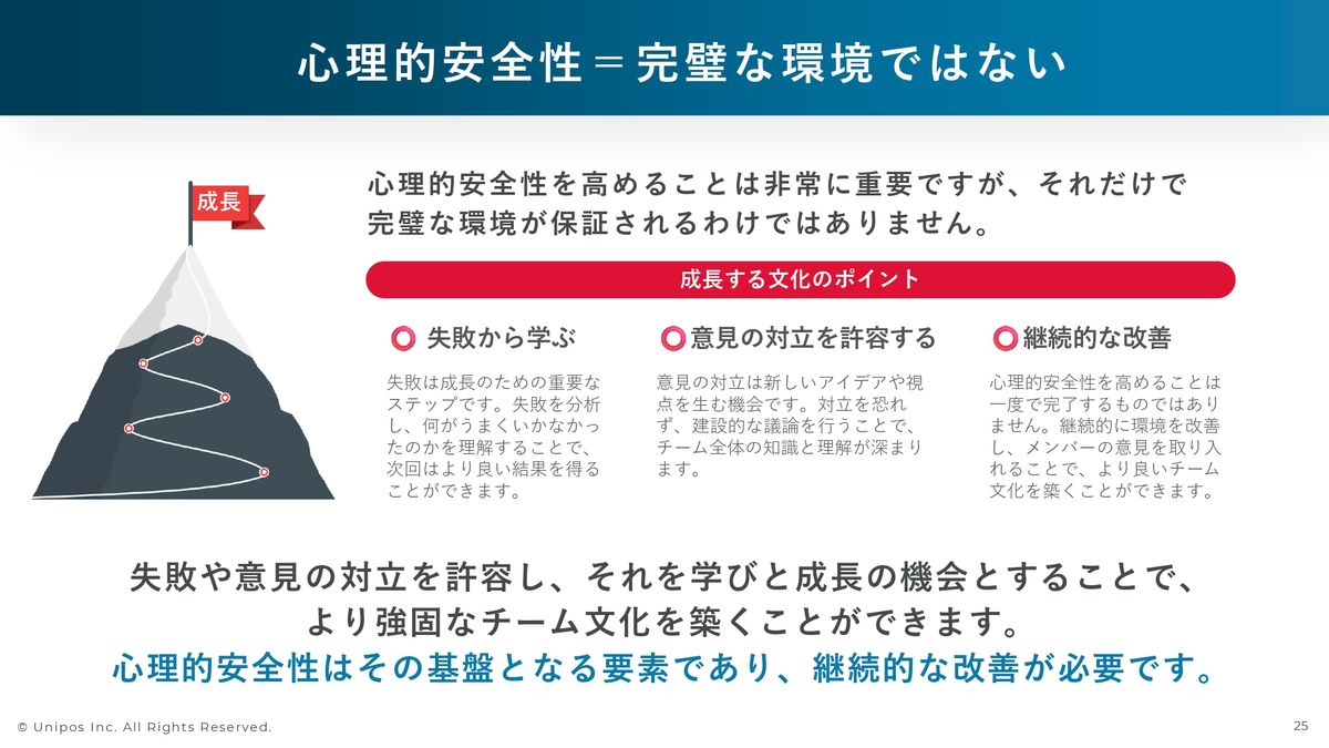 ですので、心理的安全性が高いこと自体は非常に重要ですが、やはり継続的に失敗から学んでいく必要はありますし、意見の対立を許容することも重要です。
