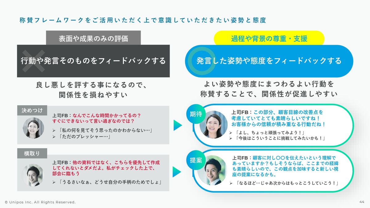 ですので、なにも結果やそれだけをフィードバックするのではなくて、発言したという姿勢、同僚のみなさまに対して向き合っていく態度、そういったものに対して良いものを良いというフィードバックをしてあげることが非常に重要です。