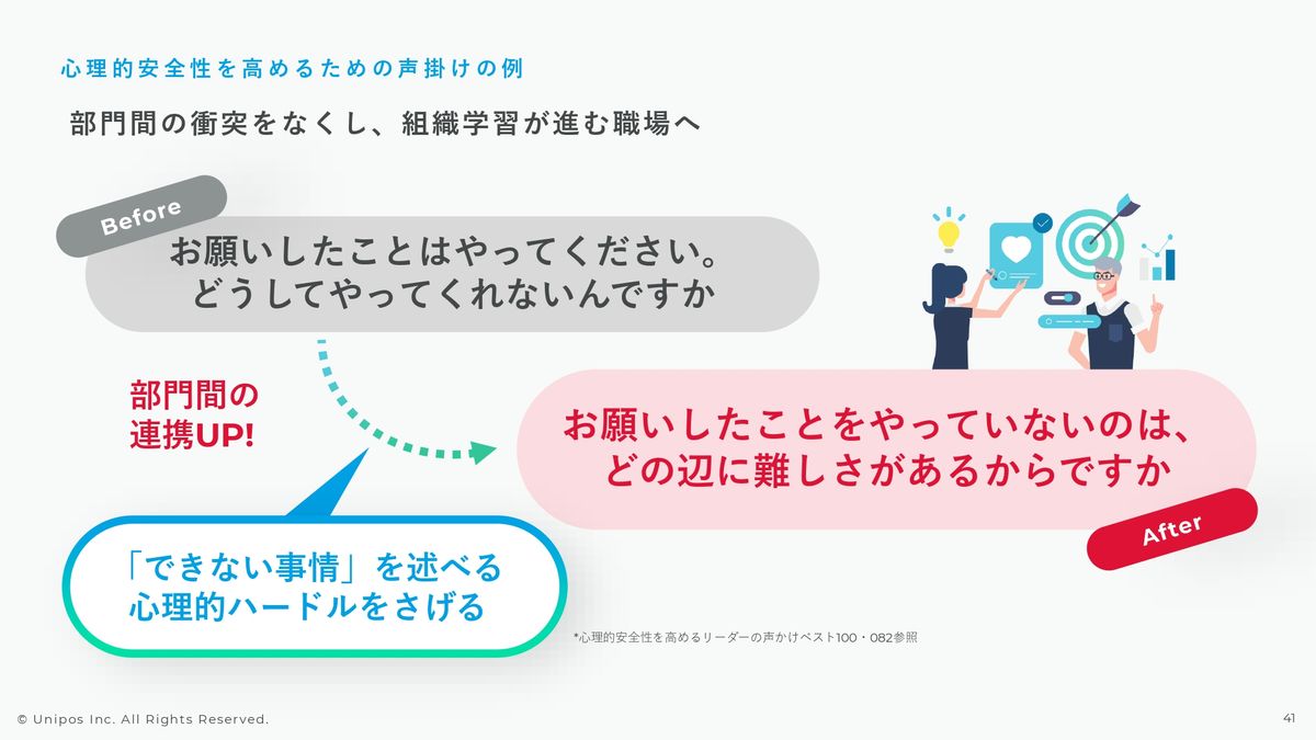 あと、このあたりは上下間というよりは部門間での連携のお話になります。「お願いしたことはやってください。どうしてやってくれないんですか?」みたいな、詰めるコミュニケーションではなくて、「どうやって我々から依頼をさせていただくと、みなさまがうまくやれますか?」「どのあたりに難しさがありますか?」という前向きなコミュニケーションも、実は部門間の心理的安全性を高める1つのブリッジになるコミュニケーションだと思います。