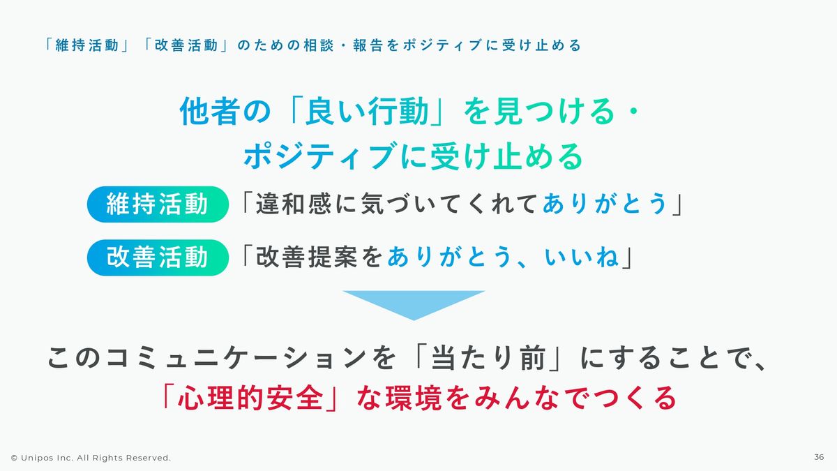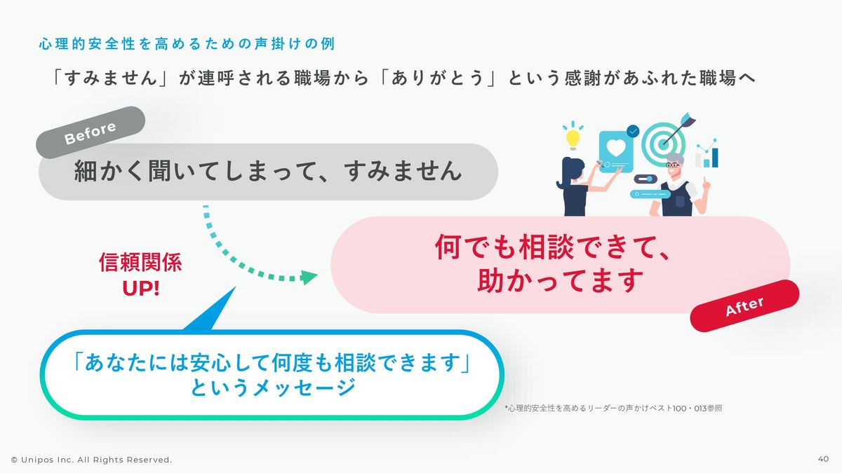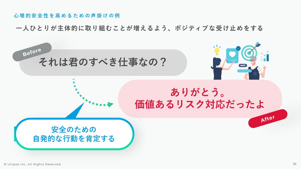 それが言いづらいことであっても適切なレポートラインにきちんと報告を上げてきたという行動そのものを前向きに捉えて承認・称賛すべきだと考えていますし、それこそが心理的安全性の高い環境を作っていくためのファーストステップだと思います。
