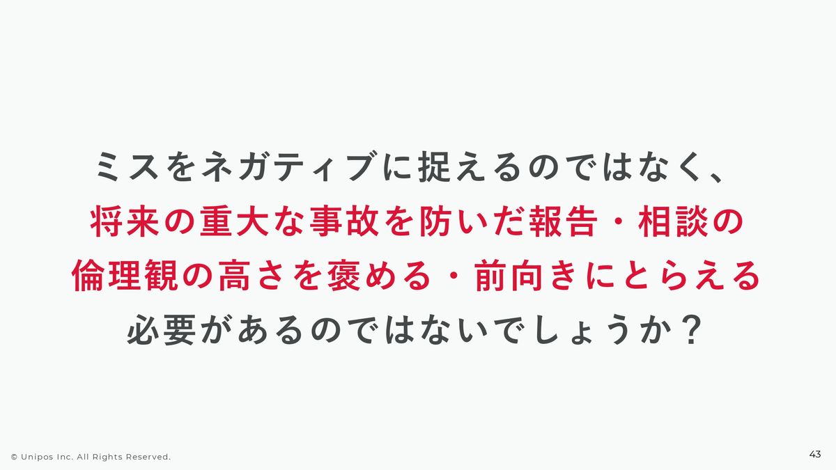 こういったコミュニケーションも、もちろんミスはミスとして受け止めなければいけないですし、もちろんミスを軽んじるということではまったくなくて、やはり会社・組織として前向きに、この事象を再発させないためにはどのような恒久的な対策を打たなければいけないのかということを、真剣に議論する必要があるかなと思っています。