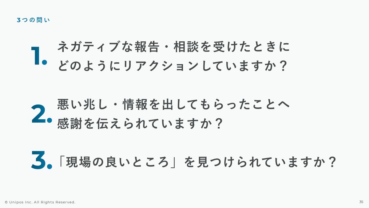 悪い兆しや情報を出してくれたこと、しっかり共有してくれたことに対しての感謝や承認をきちんとやっていますか? そして、やって当たり前ではなくて、現場の良いところ、自分たちの強み、そういったものをきちんと各現場ごとに見つけられていますか?