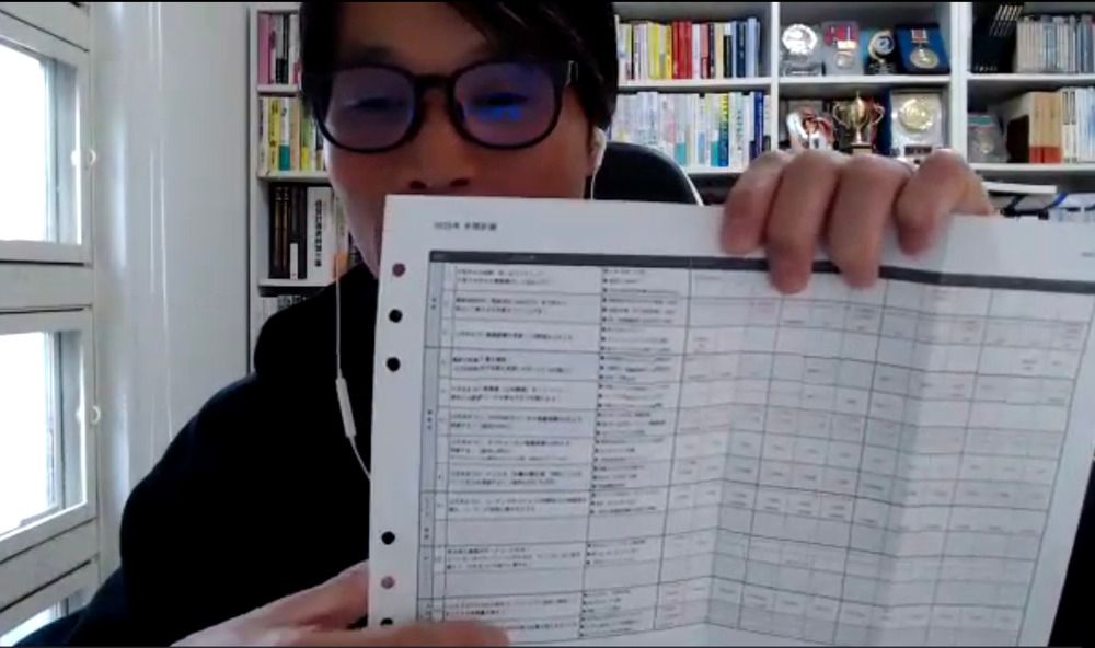 高田:これは縦に今年の目標が並んでいて、今年は12個目標がありますね。横軸では1月から12月まで割り振っていて、それぞれの目標に対してどの月で何をするかを書き出す、いわゆるガントチャートです。僕の場合は、これをA4用紙で印刷して穴を開けてシステム手帳に挟んでいます。