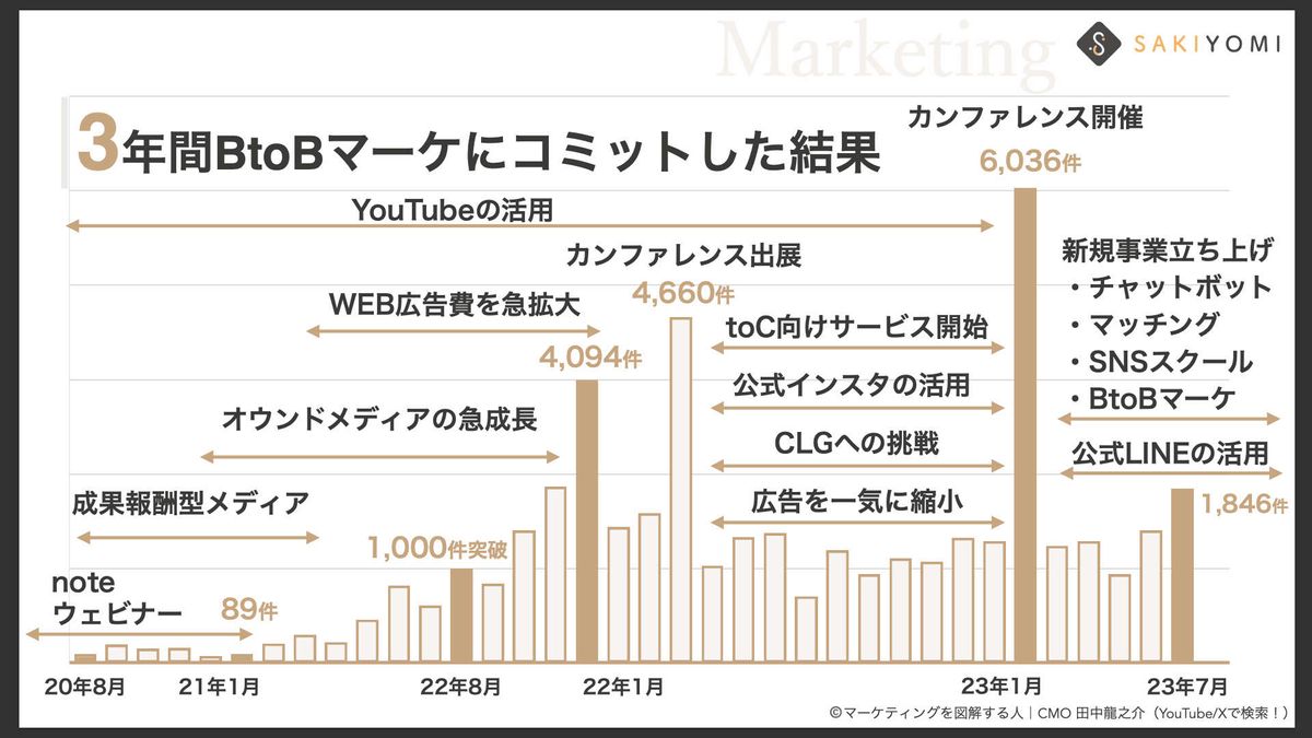 XではBtoBマーケに関する情報を発信していて、「YouTube」でも、SAKIYOMIのBtoBマーケをどう立ち上げてきたか、その裏側を含めて数値を公開しながら発信しています。最初の動画は1万再生弱ほどで、一番再生数が少ない動画でも1万再生くらいあります。最近は少し更新が止まっていますが、YouTubeチャンネルも運営しています。