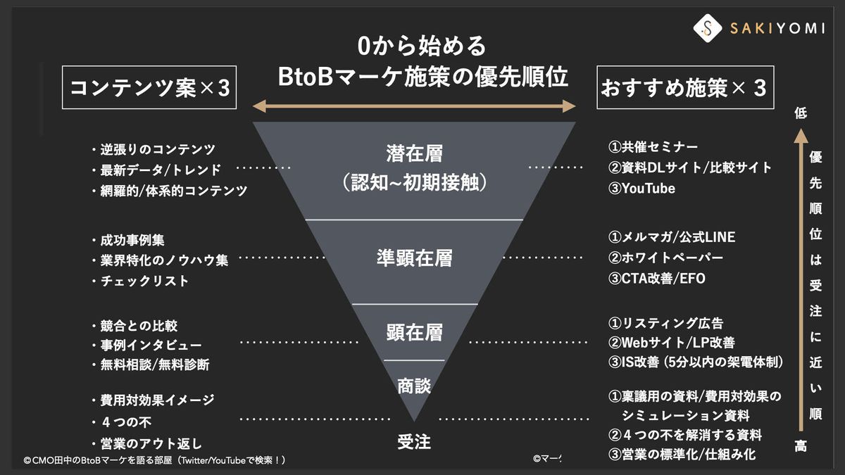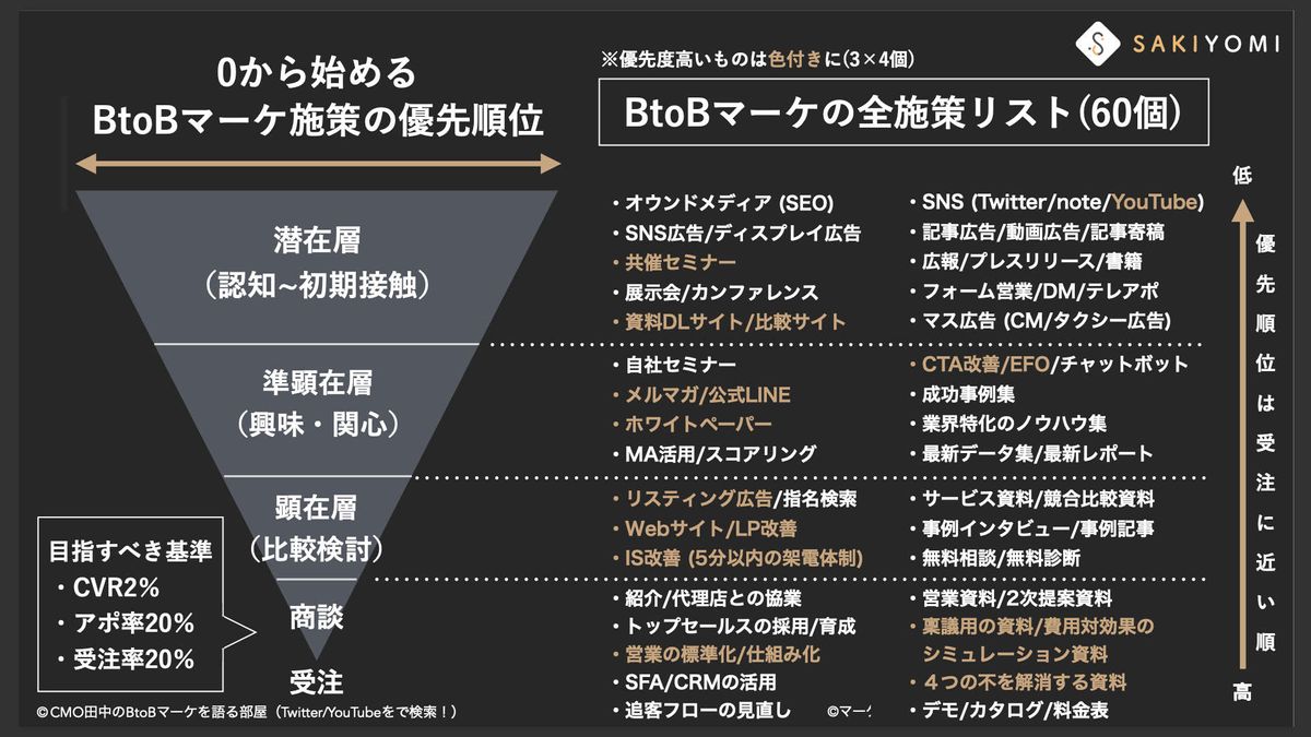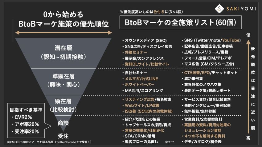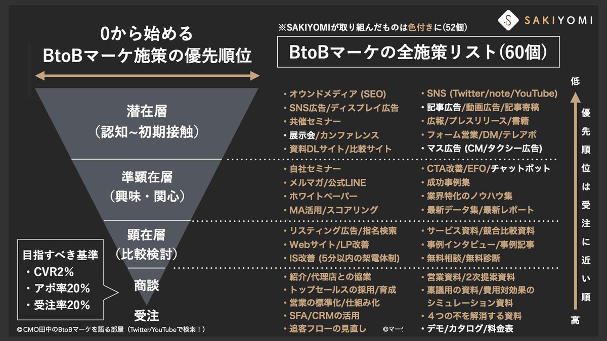 僕なりにすべてを洗い出してみたところ、全部で60個ほどあると考えています。潜在層から顕在層に至るまで、後半には営業領域に関連する施策も含まれていますが、それもマーケの一環として非常に重要だと考えています。