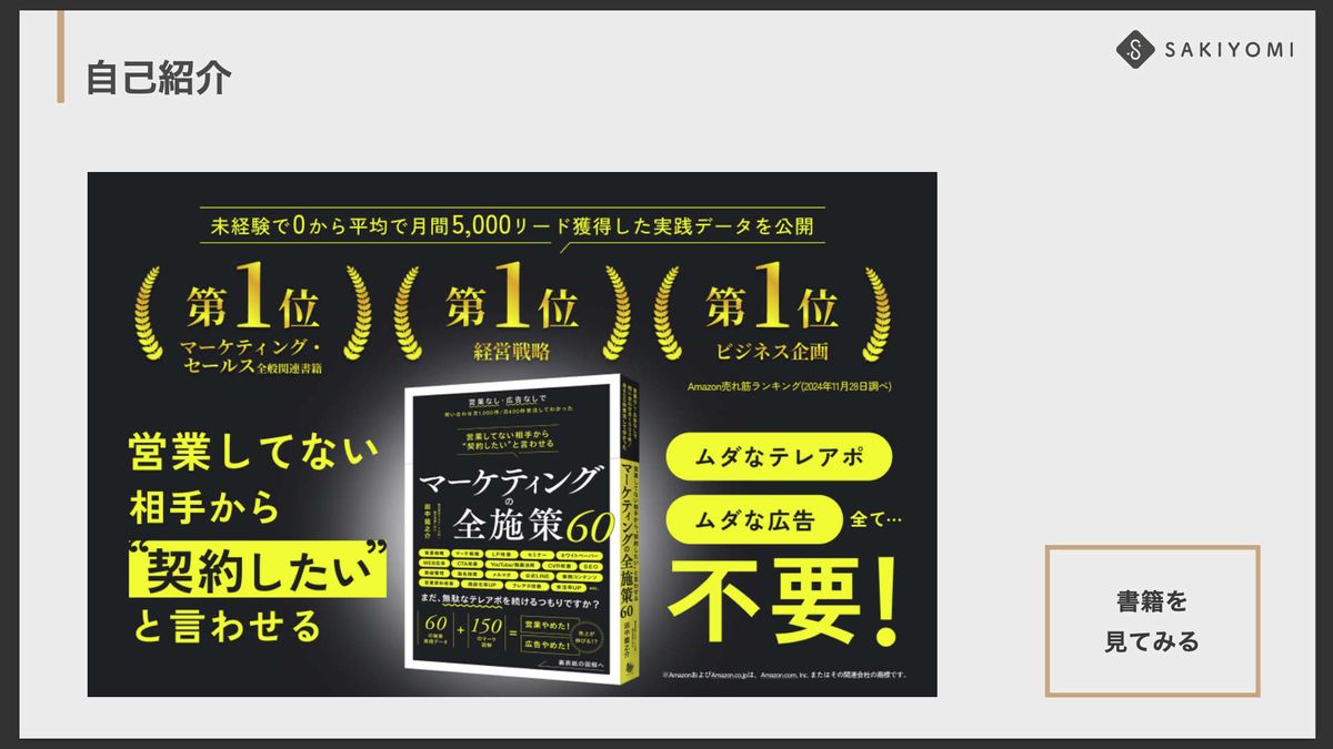 例えば、「来月、10アポ増やすには何をやればいいのか」といった具体的なヒントが見つからず、模索の時期や苦しかった時期を経て、試行錯誤してきました。そうした過去の自分に向けて、SAKIYOMIで取り組んできたことを60種類の施策にまとめ、数値データとともに公開するかたちで書いたのがこの書籍です。