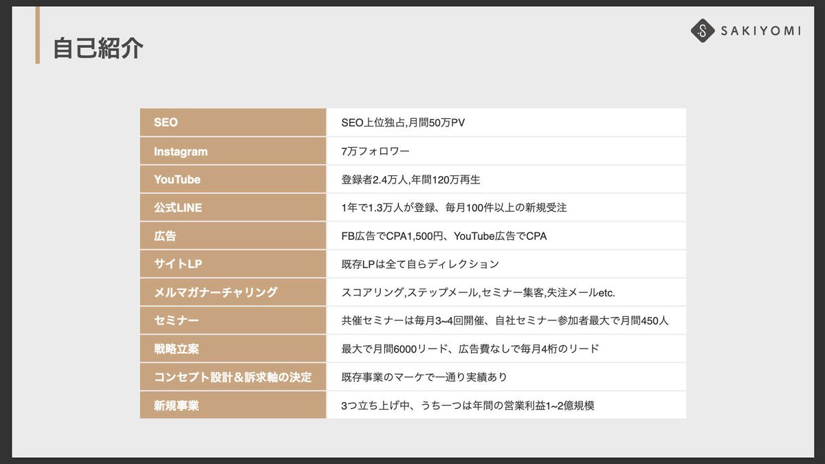 今回のテーマはマーケティングに限った話かと思いますので、少し具体的にお伝えすると、これまでSEOはもちろん、自社のSNS、Instagram、YouTube、公式LINEの運用、広告運用、LP制作、メルマガ配信、セミナー開催など、マーケ戦略の設計から施策の実行まで、すべてゼロから立ち上げてきました。