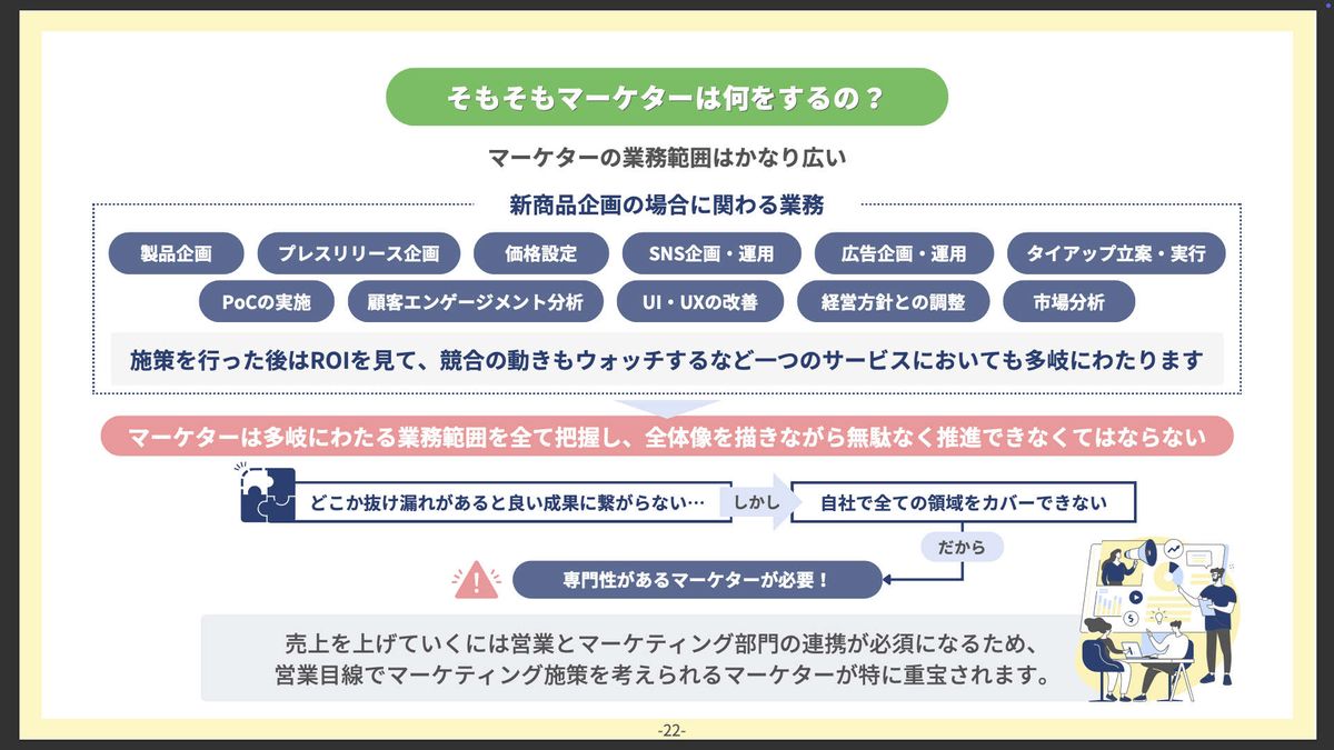 続いて、組織面のお話に移ります。そもそも「BtoBマーケターって何をする人なのか?」という話があると思います。