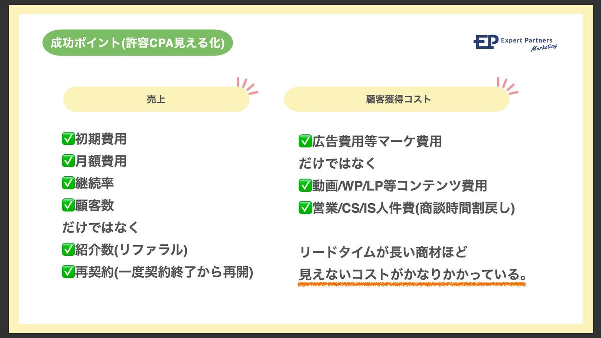 もちろん、最初は受注に近い施策から着手することが原則にはなりますが、例えば「リードタイムが長い商材を扱っている」「成果が出るまでに半年以上かかるようなマーケ施策を予定している」といった場合、当初は見えていなかったコストが後になって浮上してくることも十分にあり得ます。