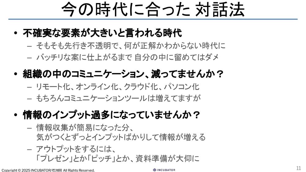 石川:これは、今の時代に非常に合った対話法じゃないかなと思っております。(昨今は)なにかとVUCAみたいな言葉を言われて、不確実な要素が多いわけですよね。いろんなことが先行き不透明で、「こんなことになるとは」みたいな。それこそ、ウクライナの話もそうですし、トランプさんの政策もそうですし、いろんなことがよくわからんなと。