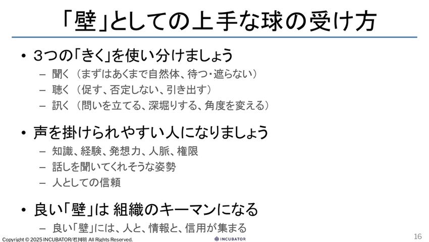 石川明氏(以下、石川):じゃあ、今度は壁打ちを受ける側の話を最後にしてもいいですか? 「球を受ける側の立場からの壁打ちはどういうものかな?」と考えると、私はある種、受けることを仕事にしているわけなんですけど、自分は3つの「きく」の使い分けをけっこう意識します。