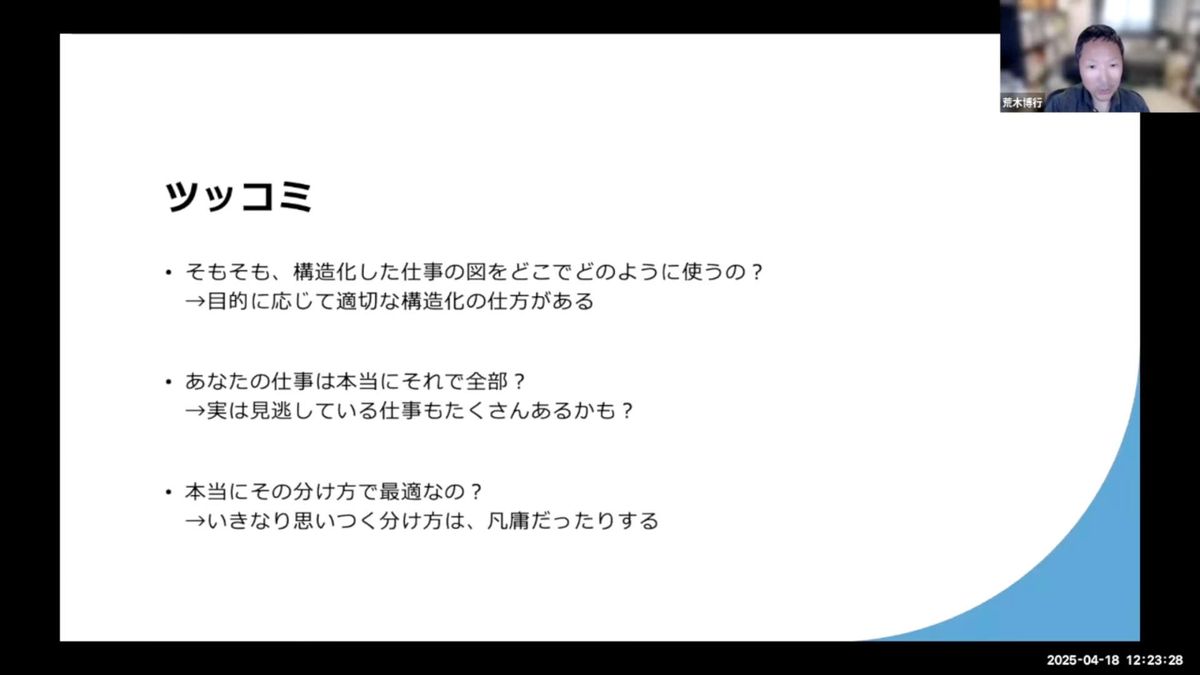 荒木:今回は「自分の仕事を誰かに説明する」という文脈で考えていると思うんですけど、その説明する相手は誰なのか。そして、それを聞いた相手は何をするのか。その前提によって、構造的整理の仕方は変わってくるという話なんですよね。