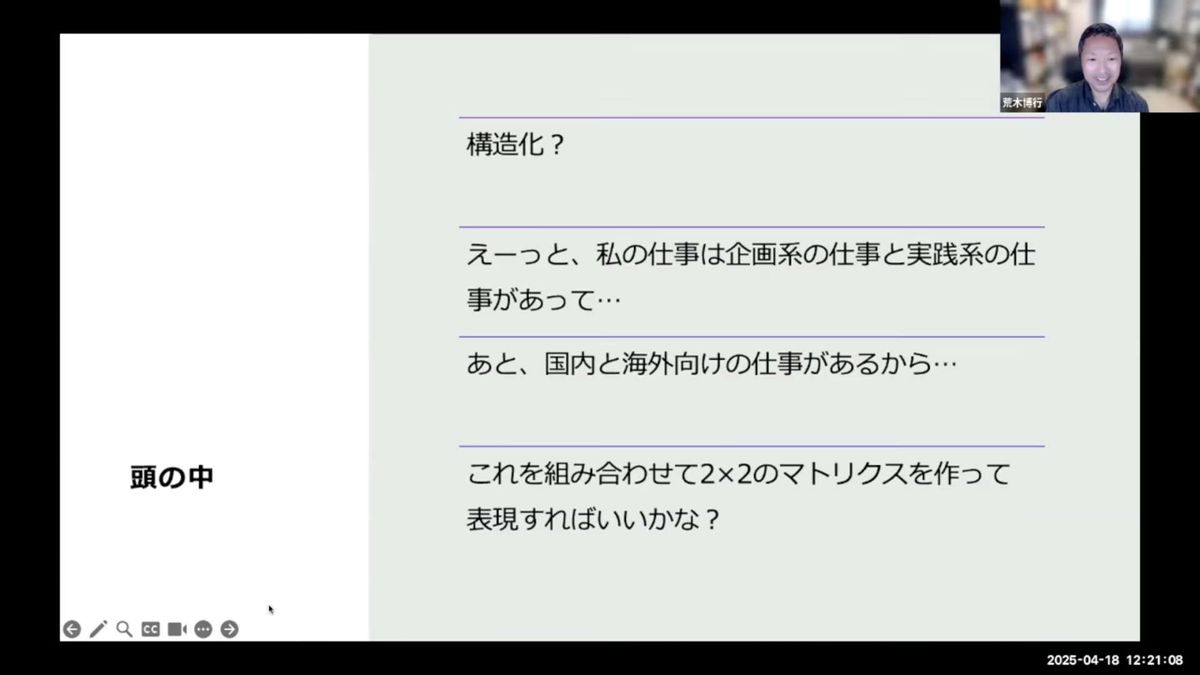 荒木:少し進みますね。例えば、頭の中の独り言をかいつまんでみると、「私の仕事は『企画系』と『実践系』に分かれていて、さらに『国内向け』と『海外向け』があるから、2×2のマトリックスで表現すればいいかな」みたいなことを考えることもありますよね。
