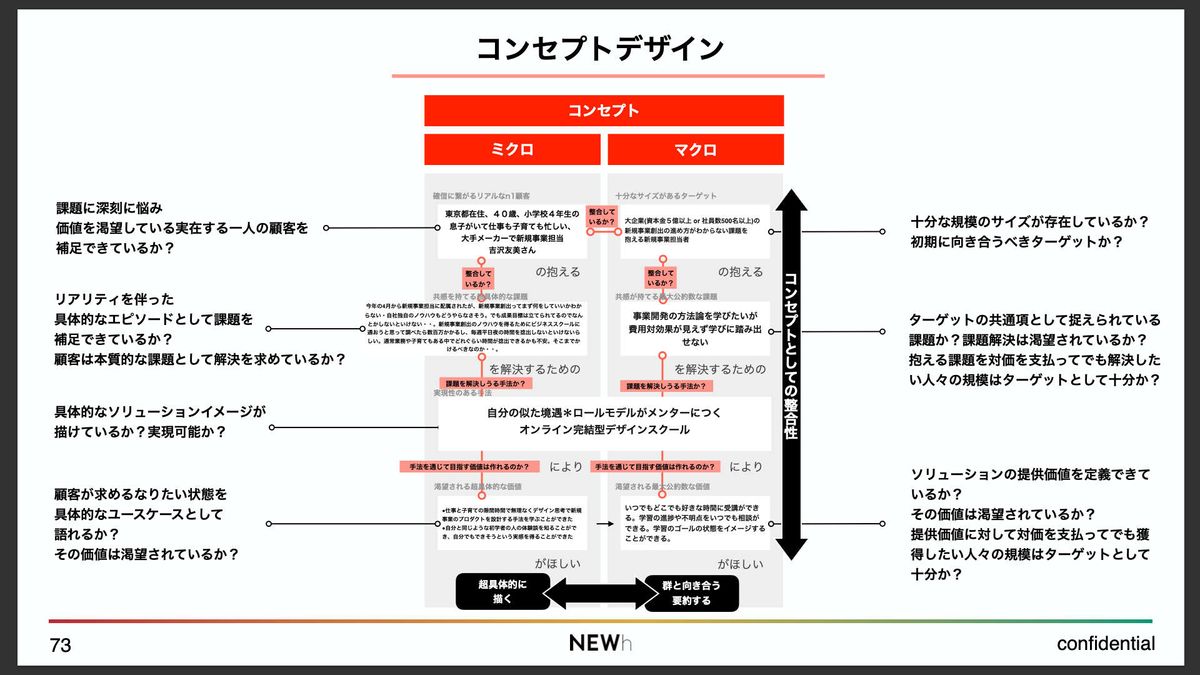 つまり、リアリティのある超具体な記述を通じて「これは本当に求められている」と感じられる一方で、マクロな視座から「ビジネスとして成立する規模がある」と言えるか。この両方の視点を行き来しながら、コンセプトの整合性を高めていくことが重要なのです。