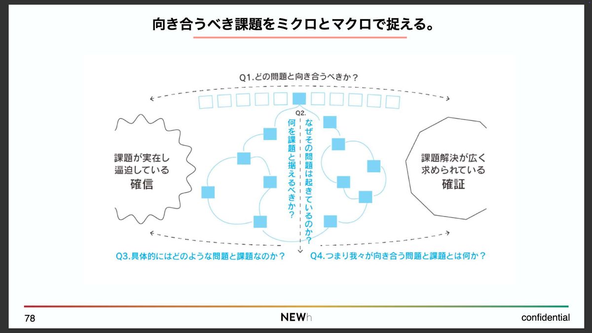 そのうえで、本当にその問題と課題について困っている人がいるのか。そういったリアリティを追求しつつ、Q4のように「一定数の困っている人が本当に存在するのか」という観点も含めて、ミクロとマクロの両面から課題を捉える。