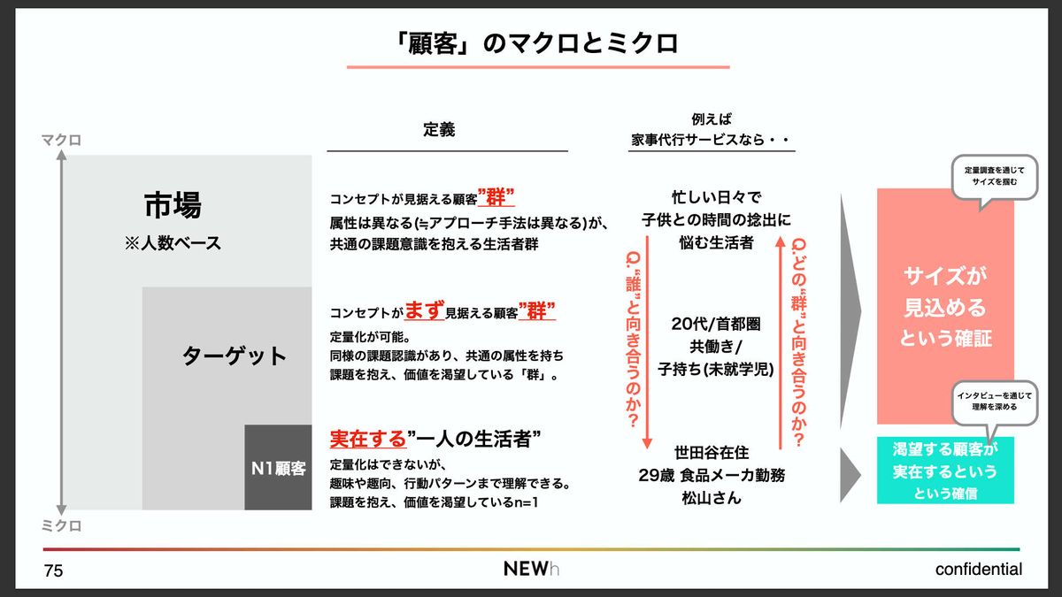 そして、もうひとつ下の階層、一番ミクロの視点にあたるのが「N1顧客」です。これは文字通り、ペルソナや想像上の人物ではなく、実在するたった1人の生活者を具体的にイメージした顧客です。