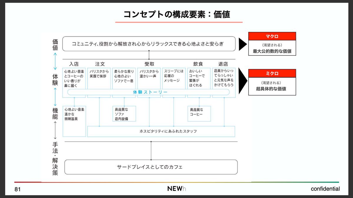 「サードプレイス」という手法的なコンセプトがあり、そのうえで、店舗に訪れたお客さんがコーヒーを注文し、過ごして、店を出るまでの間に経験する一つひとつの出来事が「体験」となって紡がれていきます。その体験を通じて、お客さんが最終的に得るもの。それが「価値」です。ある種、成果に近いものとして捉えられると思います。