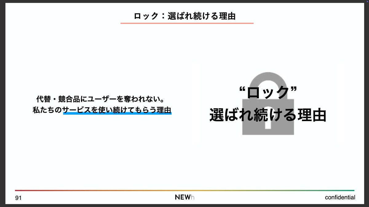一方でロックは、一度振り向いてくれたお客さんが「なぜ離れないのか」。言い換えると、「離脱せずに使い続けてもらえる理由」です。これがロックです。