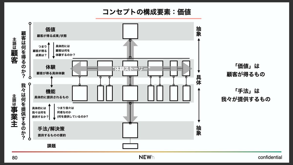 このように、価値と手法、抽象と具体、それぞれの関係性を構造的に捉えておくことが、コンセプトを描くうえで非常に重要だと思います。
