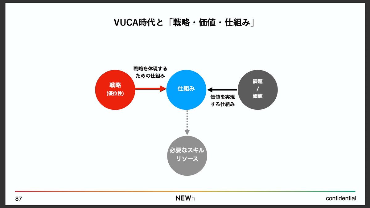 一方で、「戦略」があった時に、「その戦い方をどうやって実行可能な仕組みとして実現するのか」という、戦略から仕組みへの接続については、けっこう忘れられがちではないかと、僕は感じています。