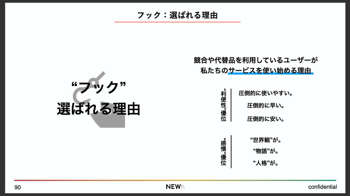 この「振り向かせる理由=フック」と「離さない理由=ロック」、この2つは常にセットで考えるべきだと、僕は思っています。優位性を考えるうえでは、まさにこの2つの問いにしっかり向き合うことが重要です。
