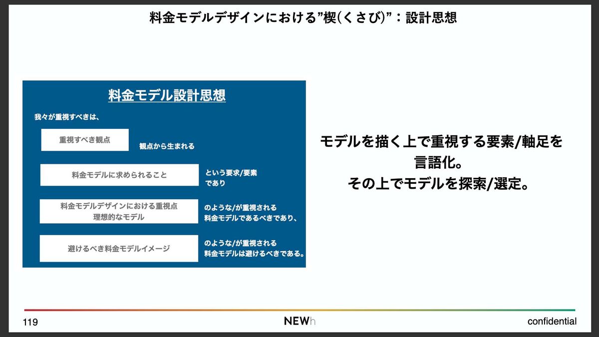 そのうえで、具体的な料金モデルをいくつか描いてみながら、最適なものを探っていくやり方です。料金モデルを描くうえでは、こういう進め方がけっこう大事ではないかと思います。