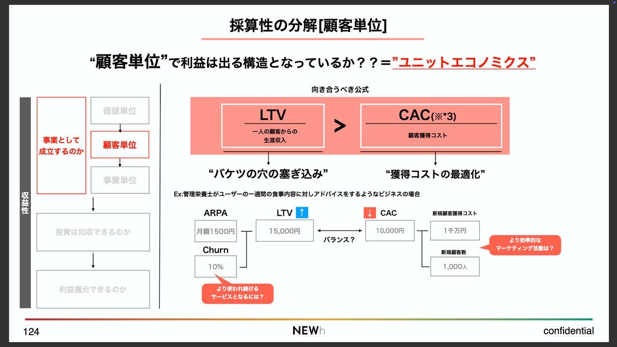 この価値単位での採算性が取れていれば、そのうえで、より長い顧客との関係の中でも採算が取れるのかという観点に進むことになります。それが「ユニットエコノミクス」です。