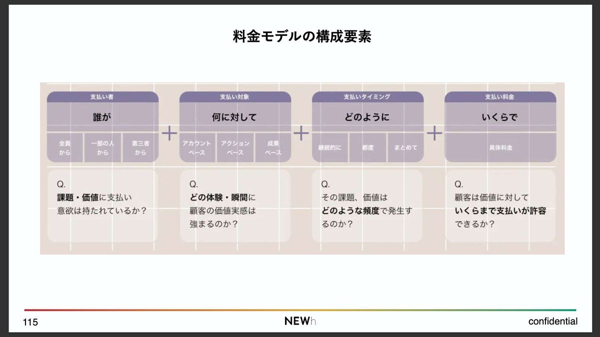 例えば、誰が支払うのか、つまり支払い主体の話。それから、何に対して支払われるのか、つまり「支払いの対象」は何か。どんな体験価値に対してお金が支払われるのかという視点です。さらに、支払いがいつ行われるのかという「タイミング」。そして、最後に「いくらで売るのか」というプライシング。