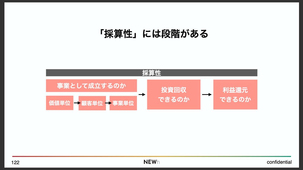 さらにその前には、「価値単位で利益が出ているのか」とか、「顧客単位で採算が合っているのか」みたいな、もうちょっと細かいレイヤーでの確認も必要になります。こういう階段を上がっていくような構造を意識しながら、「ちゃんと採算が取れるのか」を見ていく。この視点を持つことがすごく大事だと思っています。