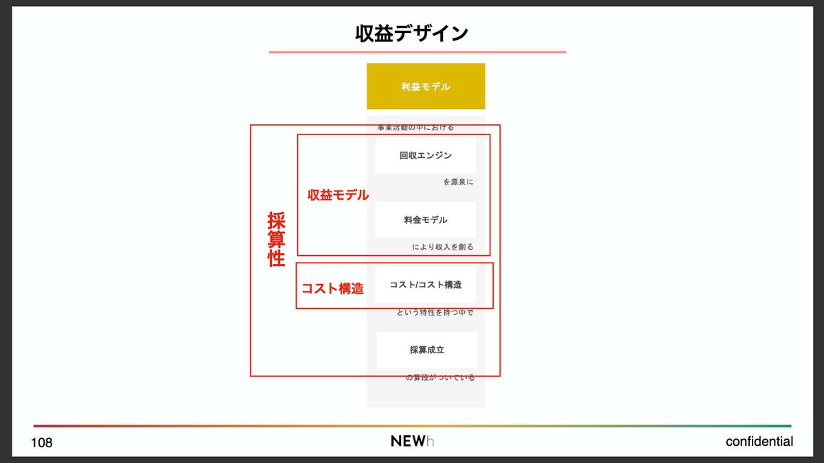 1つ目は「収益モデル」。これは、何を源泉にしてどうやって対価を得るのかというインプット側の話です。2つ目は「コスト構造」。つまりキャッシュアウト側の話です。そして3つ目が「採算性」。インとアウトを含めて、全体として収支のバランスが取れるのかどうかを問う要素です。