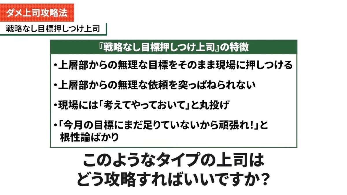 ——2人目は「戦略なし目標押しつけ上司」。特徴は、上層部からの無理な目標をそのまま現場に押しつける。上からの無理な依頼を突っぱねられない。現場には「考えておいて」「やっておいて」と丸投げ。「今月の目標にまだ足りてないからがんばれ」と根性論ばかり。こんなタイプの上司はどう攻略すればいいでしょうか。